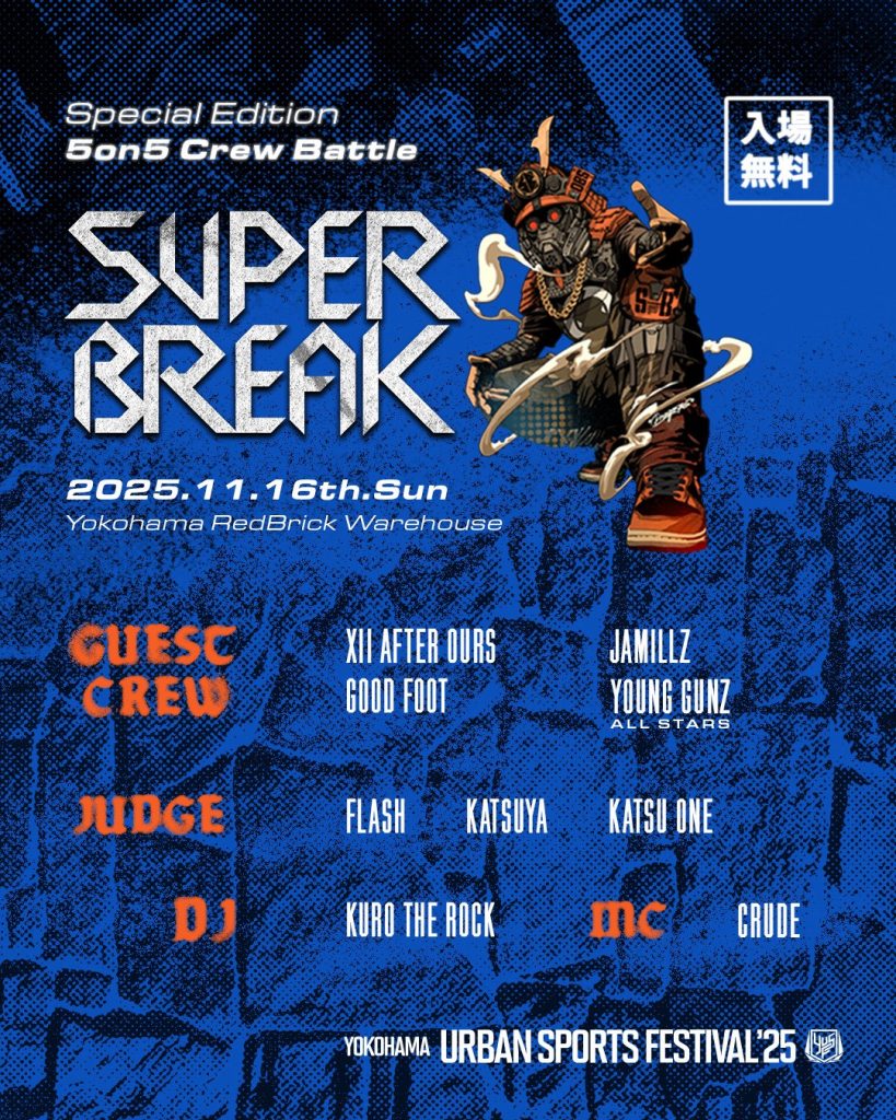 【DAY2|SUPER BREAK “Special Edition 5on5 Crew Battle”】日本唯一のオリジナル国際大会として、国内外から高い評価を受ける「SUPER BREAK」。今回はYUSF ʼ25内での特別版として、選ばれし4チームによる招待制5on5クルーバトルを開催。全国から世界レベルのブレイカーが集結。まさに“スペシャルエディション“の名にふさわしい対決を見逃すな︕優勝クルーには賞金20万円が贈られる。