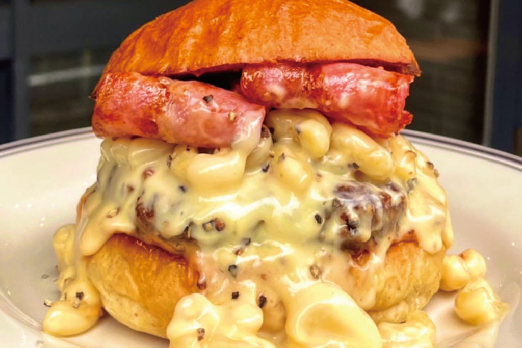 アメリカの定番家庭料理「マカロニチーズ」をたっぷり挟んだ、肌寒い季節にぴったりの『マッケンチーズバーガー』。全てオリジナルレシピの当店のハンバーガーをぜひご賞味あれ!