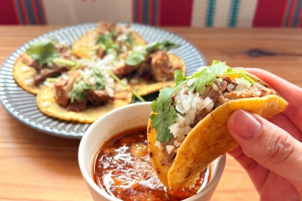 ニューヨークやロサンゼルスで大人気のメキシコ料理「ビリア」を、とうもろこしの香りが香ばしいトルティーヤで挟み、肉を煮込んだ旨味たっぷりのスープにディップして食べる本格タコス。